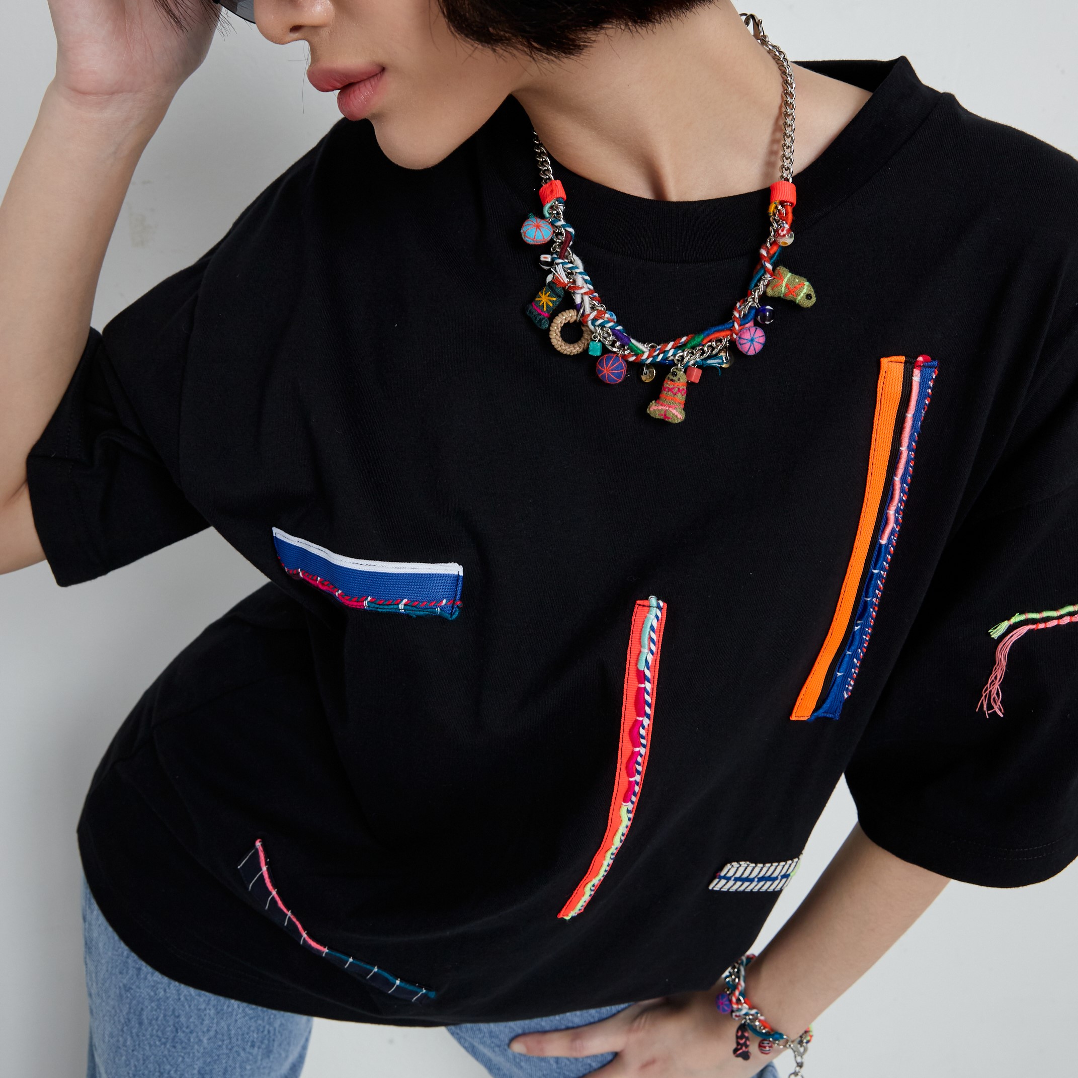 เสื้อยืด PANABE Upcycled Thread TEE One of A Kind* ที่ได้รับแรงบันดาลใจมาจากการตีความเอกลักษณ์ท้องถิ่นจากลายพานาเบะ หรือการตัดต่อแถบผ้าสีของชาติพันธ์ทางตอนเหนือของไทย เล่าผ่านเสื้อยืด Oversized ทรงเก๋ที่สวมใส่ได้ง่าย มาพร้อมดีเทลปักแถบสีเพิ่มลุค Sporty พิเศษด้วยการร้อยเรียง UPCYCLING เส้นด้ายที่เหลือจากการปักงานฝีมือจากชุมชนในจังหวัดเชียงราย